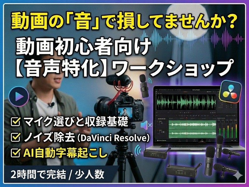 マイクの選び方から、収録時のレベル設定、編集ソフトでのノイズ除去、そして最近ニーズが急増しているAIを活用した自動字幕起こしまで、2時間で一気に学べます。