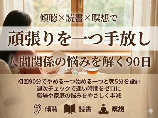 読書で感情を言語化し、傾聴で安心の土台をつくり、週次チェックと瞑想トレーニングで迷う時間をゼロに近づけます。