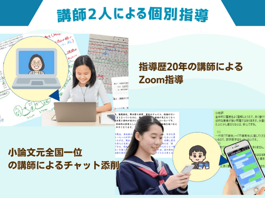 「マンツーマン指導より手厚い!」Wブレインメソッドは、生徒1人につき講師2人だから、どこよりも手厚く、精度の高い対策ができます。元小論文全国一位&京大論文入試合格&現役行政書士の賀茂千歳と、指導歴20年・小論文入試に精通する北島郁子がタッグを組み、二人三脚で文章力を鍛える独自メソッドです。