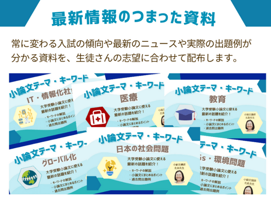 志望校の小論文の傾向、生徒さんの小論文を書く力や他の受験日とのスケジュールなどを加味して、一人一人の学習プログラムや課題・参考資料をお作りします。また、その場の状況に応じて臨機応変に対応し、最後の最後まで合格に近づけるよう最善を尽くします。