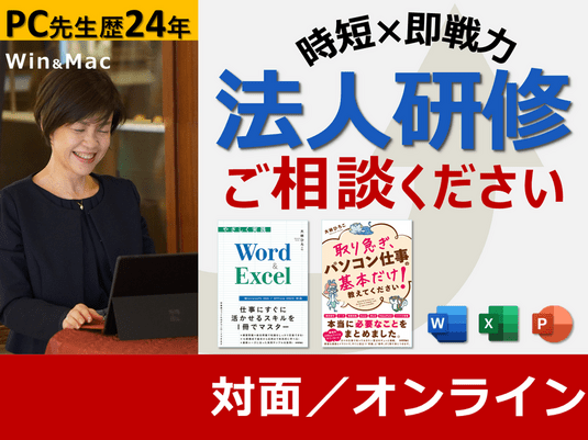 パソコン仕事の基本を身につけ即戦力を育てます。体系的な学びからスグに役立つ時短テクニックまで身につく法人様向け研修です。【PC先生歴24年】