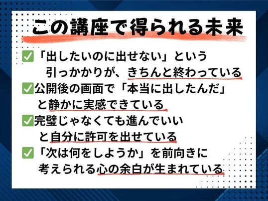 出版を未完で終わらせないための実装特化プログラム。迷いと先延ばしを断ち切り、8週間で公開まで導く具体作業を個別に伴走・完遂させる設計力