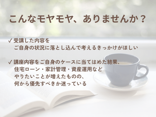 レッスン内容:将来設計・家計管理・住宅ローン・資産運用など