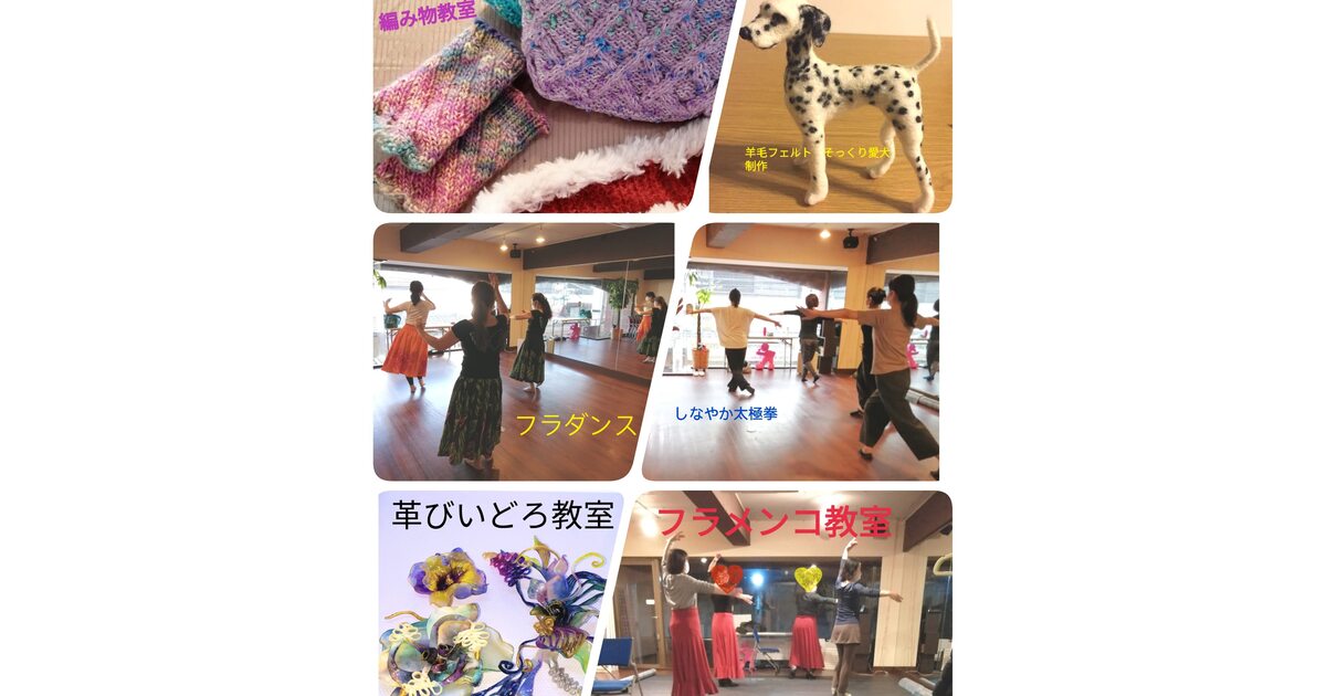 ダンスはフラメンコ、フラダンス、ズンバ、ジャズダンス Hiphopと体験も可能。そして、太極拳や瞑想、ヨガ、ピラティスと、あらゆるジャンルをご用意。じっくりゆっくりやりたい方には手芸などもおススメ!編み物、羊毛フェルトで愛犬制作も楽しめる。また、話し方や、朗読レッスンなどもできる。