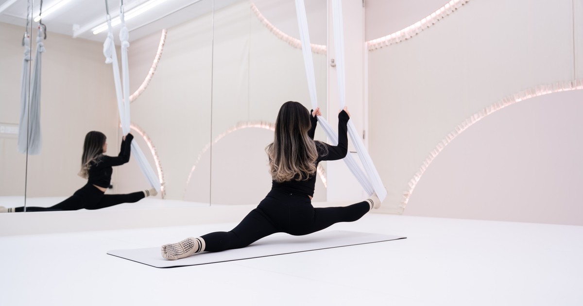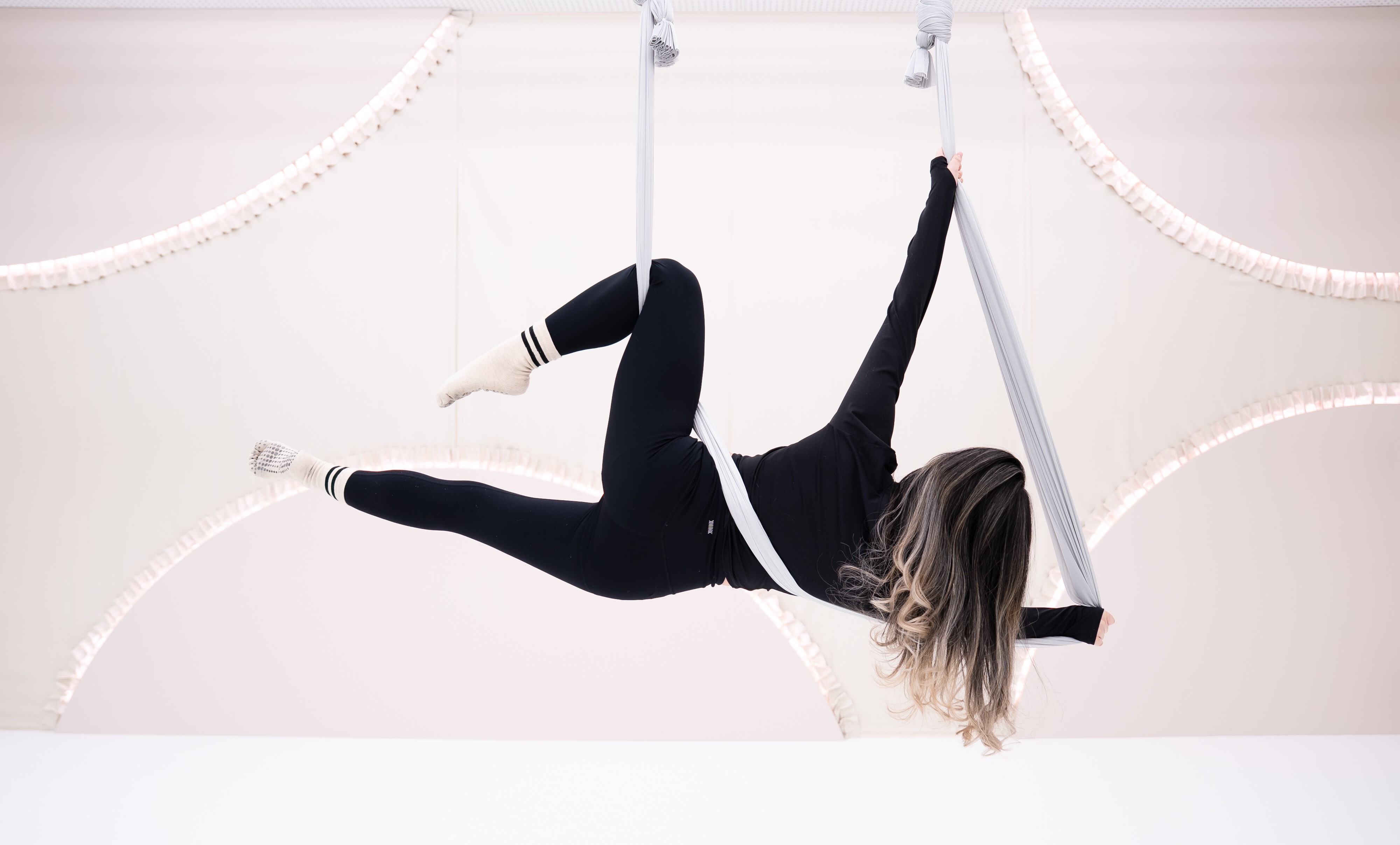 エアリアルヨガで動きのしなやかさと伸びやかな呼吸を引き出す。