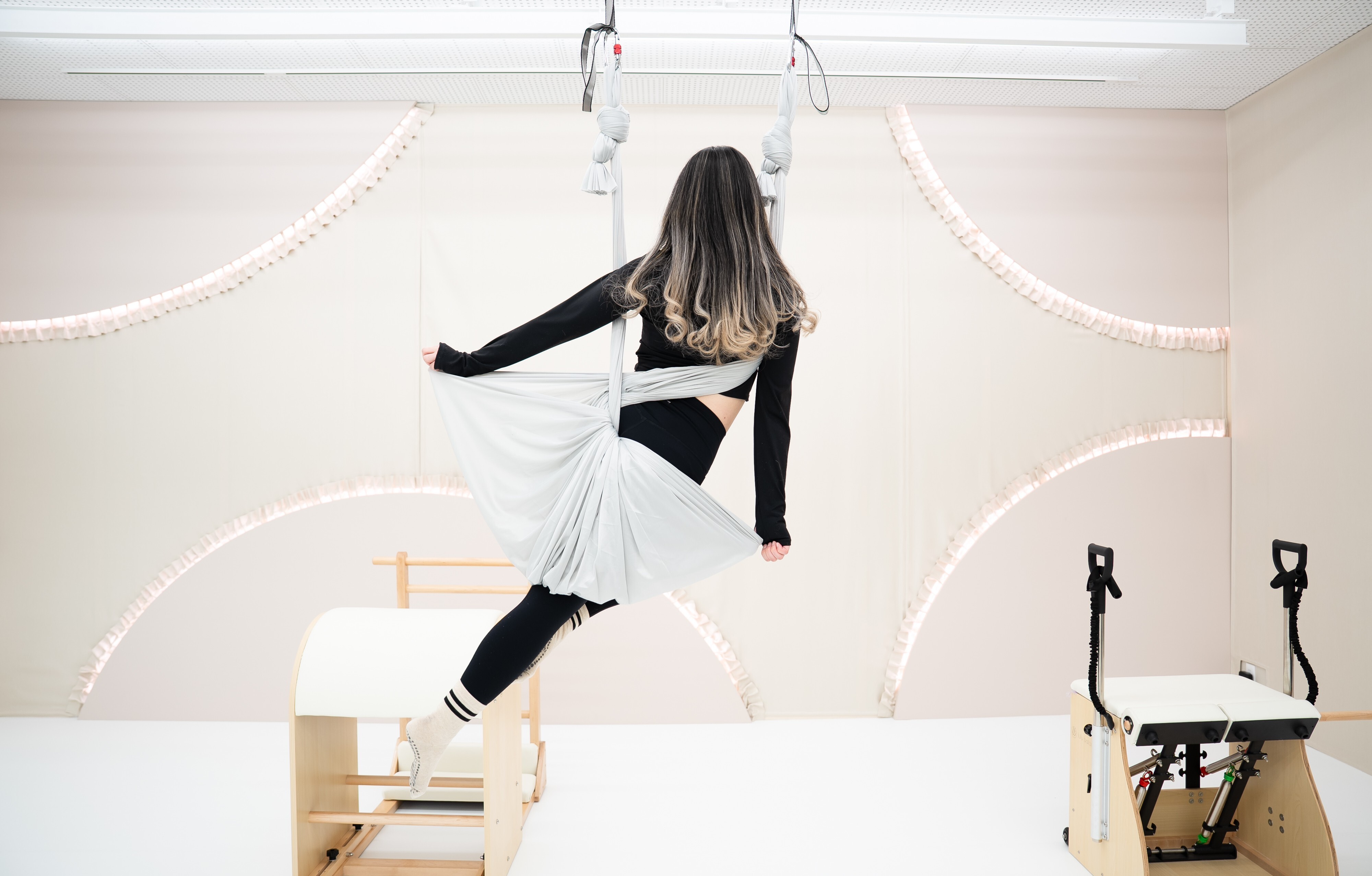 当スタジオでは、身体を整えるマシンピラティスと、重力から解放されるエアリアルヨガを組み合わせた独自メソッドを通して、