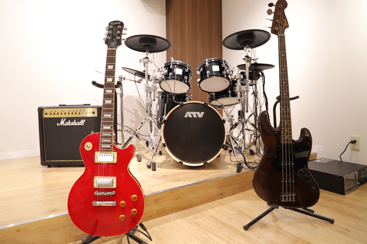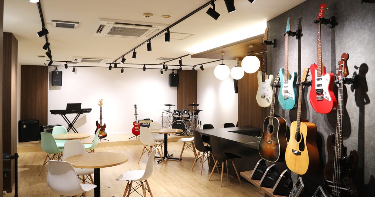 吉祥寺駅から徒歩5分、月額9,800円で1日3時間まで通い放題、初心者歓迎!選べる6パート・レンタル無料、カフェ風の空間で好きな時に自由に練習できます。