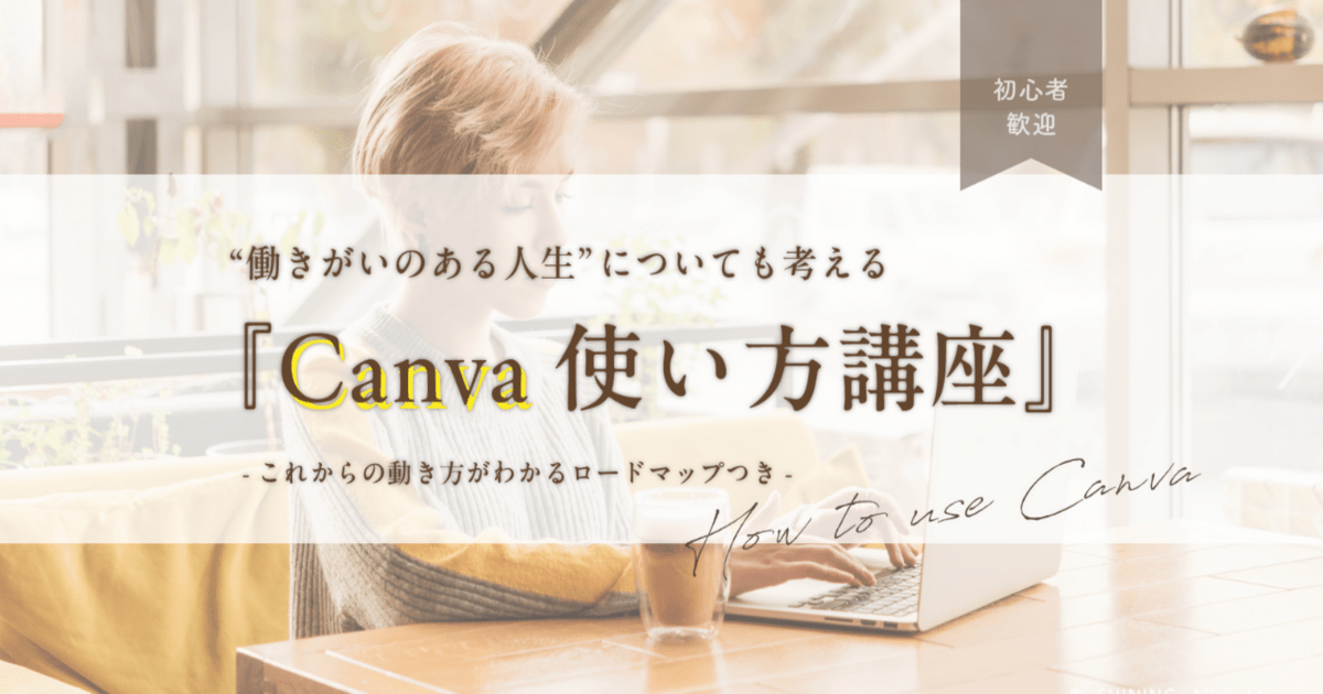 SHININGのCanva使い方講座は、Canvaの使い方だけでなく、個人が生き生きと生きていくための”働き方”についても考える講座です。Canvaは、副業はもちろん、個人で立ち上げるスモールビジネスやフリーランスなどさまざまなキャリアに活かせるツールです。そのスキルを磨きながら、自分に合った生き方や働き方についても考え、そのためにこれからどう動いていけばいいかをいっしょに考えます。