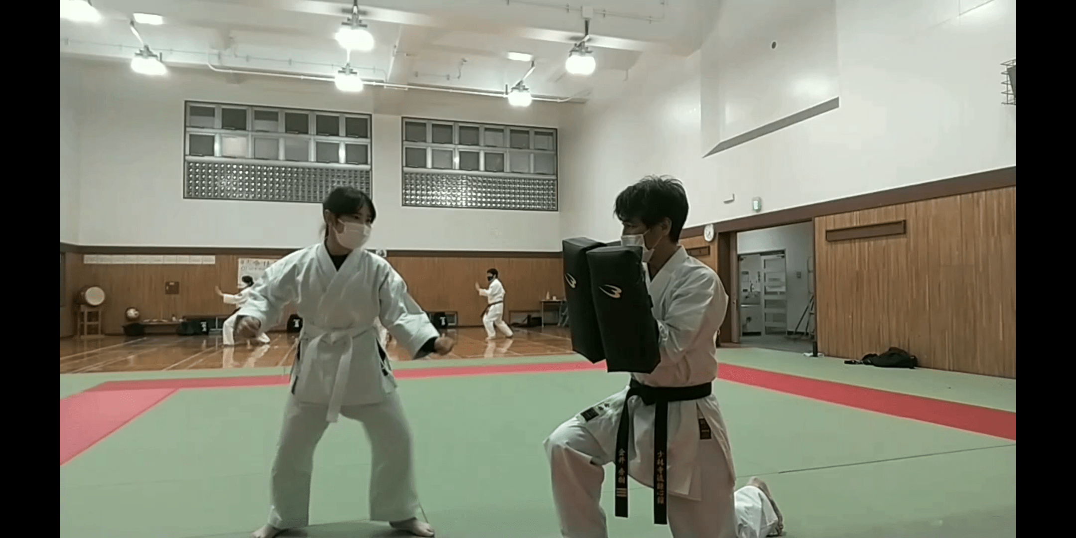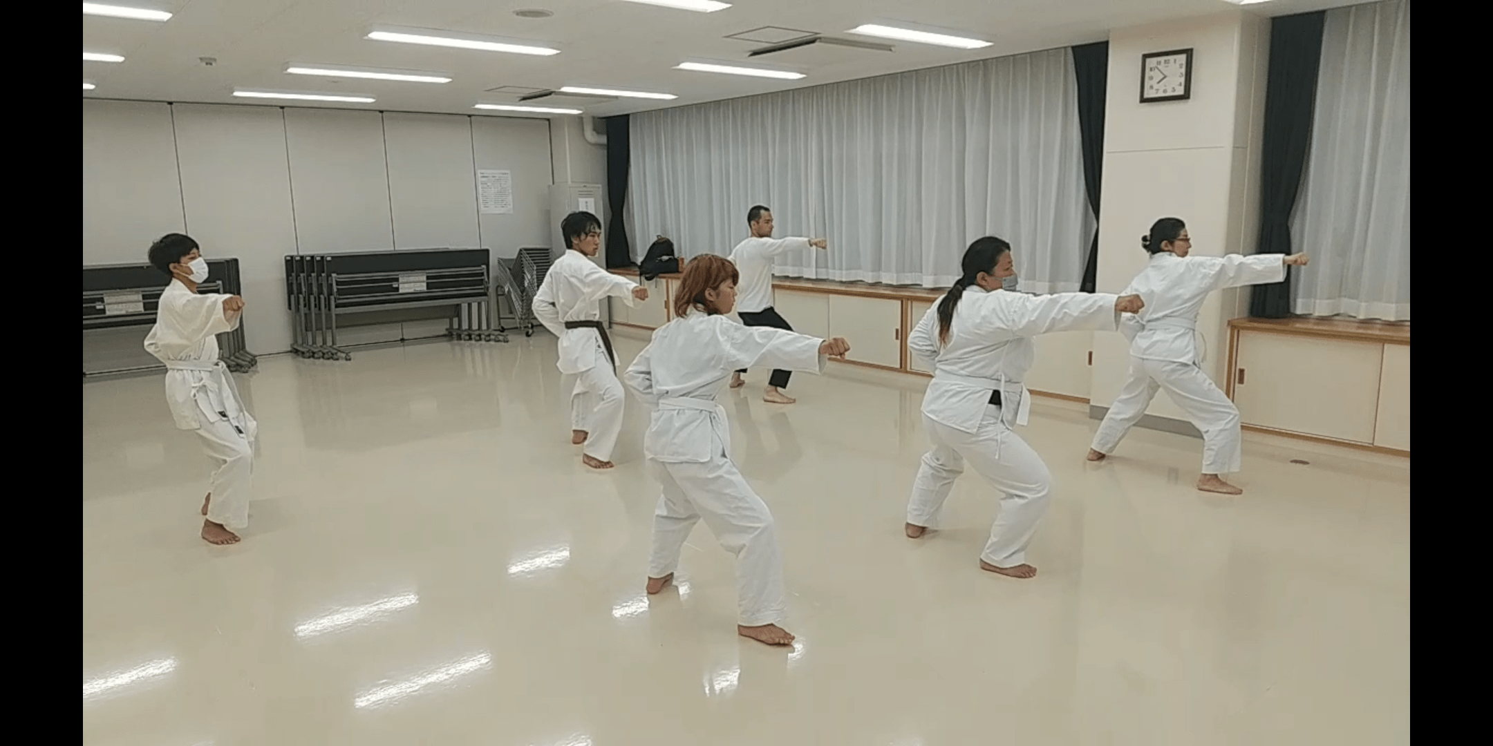 基本稽古で学んだ突きや蹴りを、今度は前後に動きながら行います。