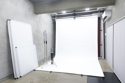 コンクリ壁打ちっぱなしの白・黒背景紙常設スタジオ。商用・個人での撮影、作品撮りなどに。100㎡ある屋上も撮影で使用可。
