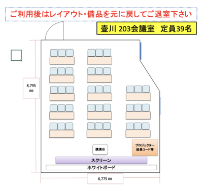 ・退室時には、清掃とゴミ処分、元のレイアウトへ原状回復をお願いします 。