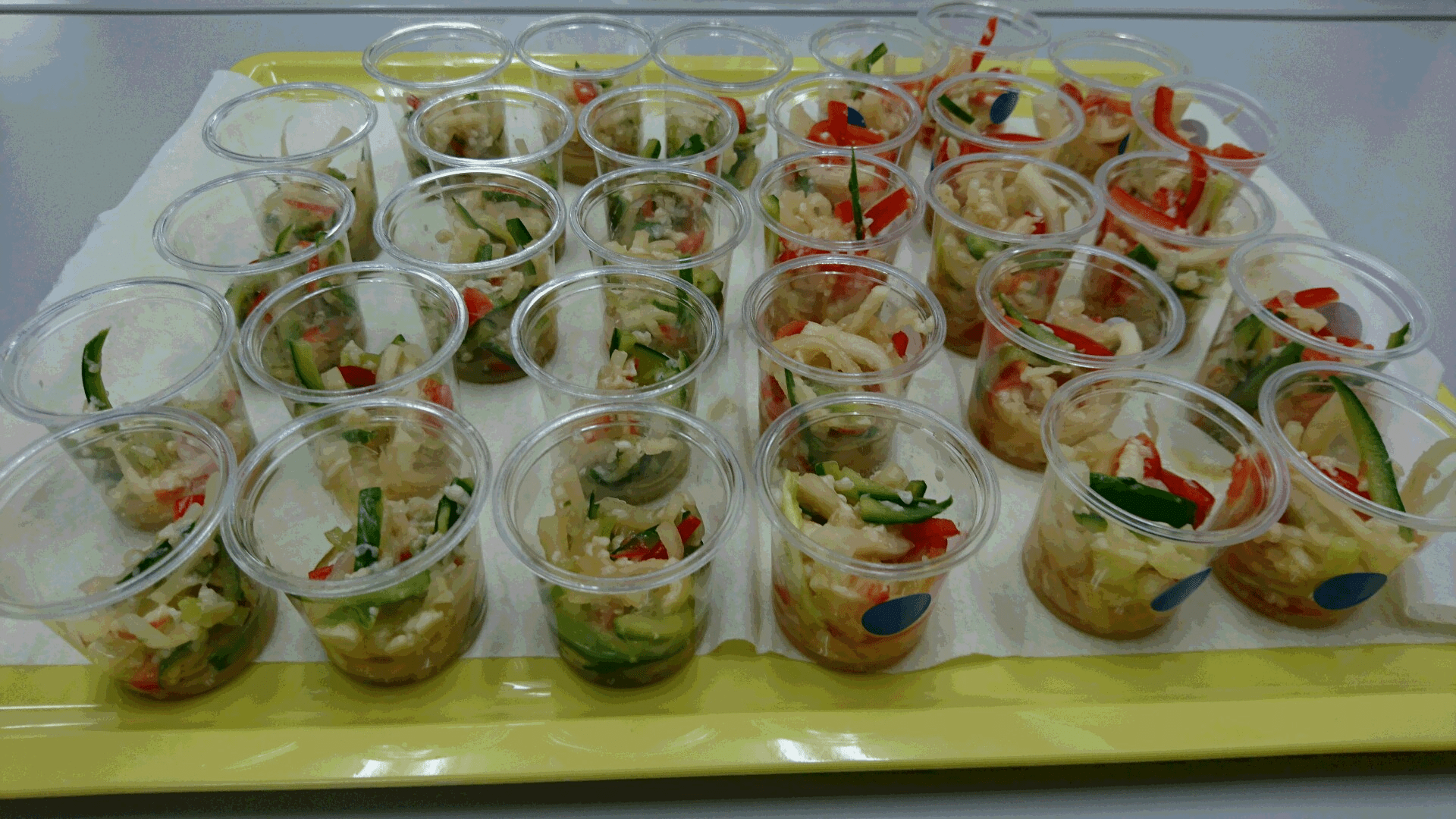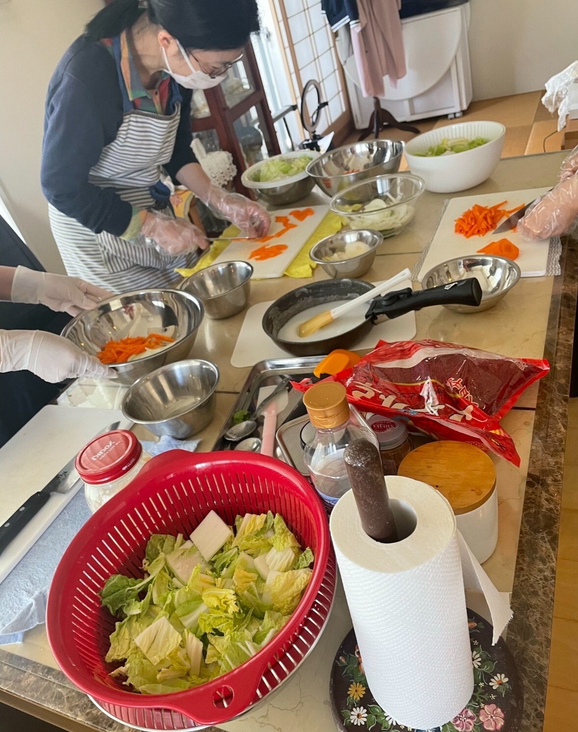 皆さまでキンパを作り、切った断面を綺麗に仕上げるにはいろいろとコツがあり時間を割いてしまうので、チャプチェとワカメスープはデモンストレーション形式にさせていただいております。