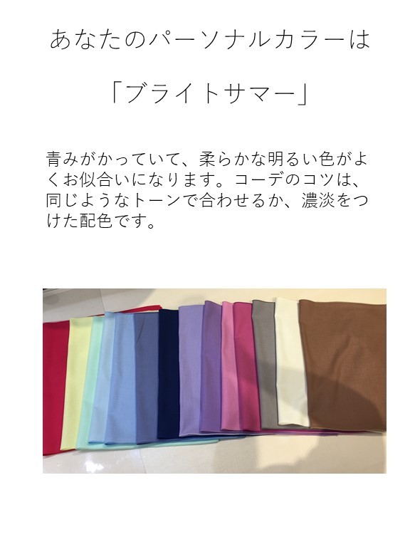 パーソナルカラー、ネット上での診断ツールみたいなのは気になって何回かやったことがあったのですが、それとは全然違う結果になってやっぱりプロに聞くと違うのだなと思いました。