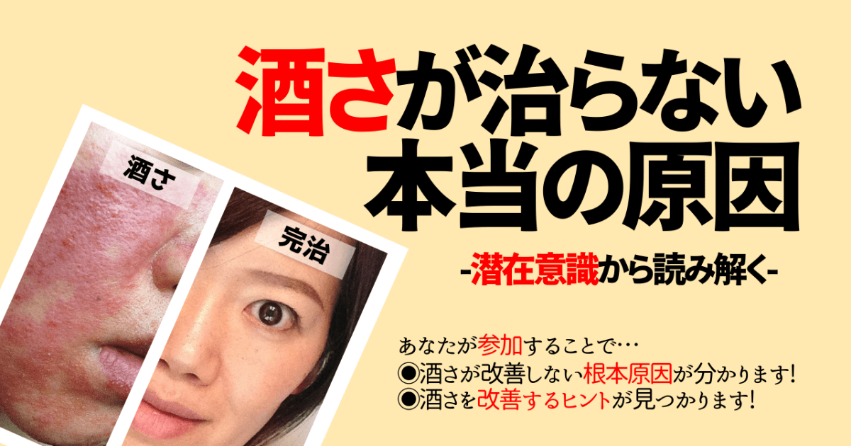 講座では、酒さ(皮膚炎)が改善しない本当の原因を潜在意識(深層心理)から読み解きます。そして、酒さ改善のヒントをお伝えします。