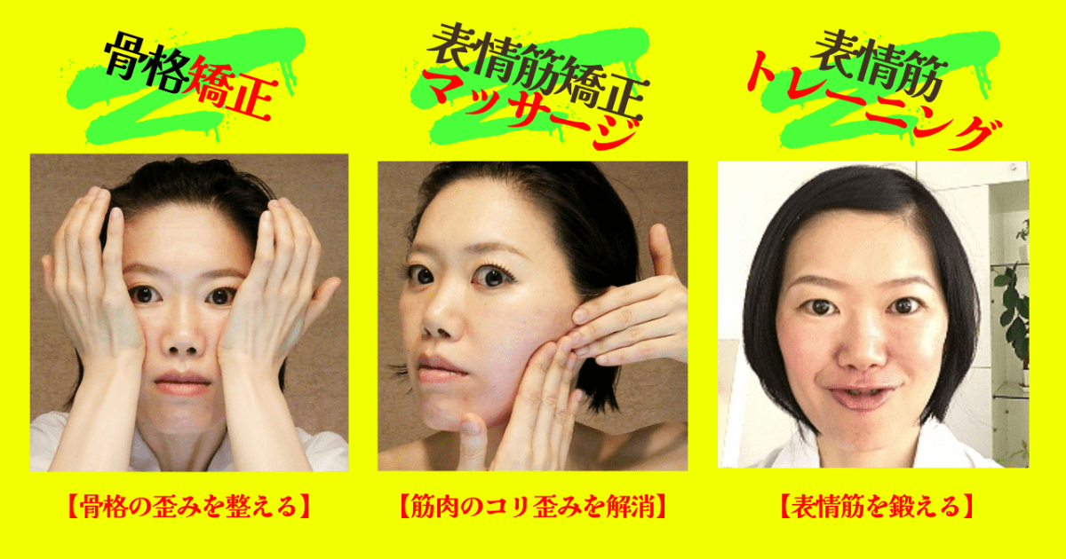どのようにアプローチをすのかというと、『骨』は『骨格矯正』、『筋肉』は『表情筋トレーニングと表情筋矯正マッサージ』、『脂肪・皮膚(リンパ)』は『形状記憶リンパマッサージ』で凝りをほぐしたり、骨格を整えたり、筋肉を鍛えたりします。