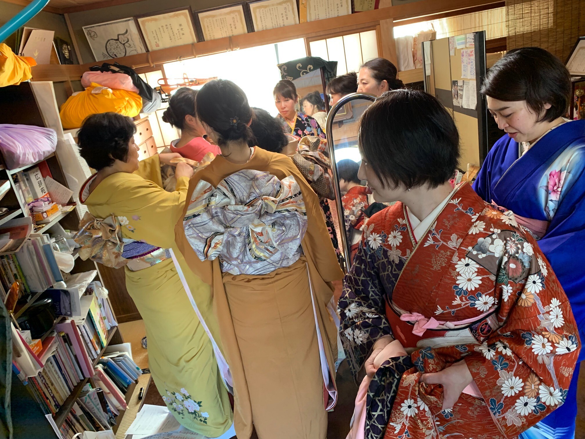 そして2ヶ所の着付け学院に通い、4ヶ所目のきものカルチャー研究所で2004年に自宅教室を開きました。その間は結婚式場、写真館、レンタル衣装屋と様々な場所で着付けを担当しました。また様々な和の世界を知りたいと川越唐桟手織の会や風呂敷研究会で風呂敷の勉強、車イス着付け、指織り、水引と好奇心の動くままに勉強を続けてます。