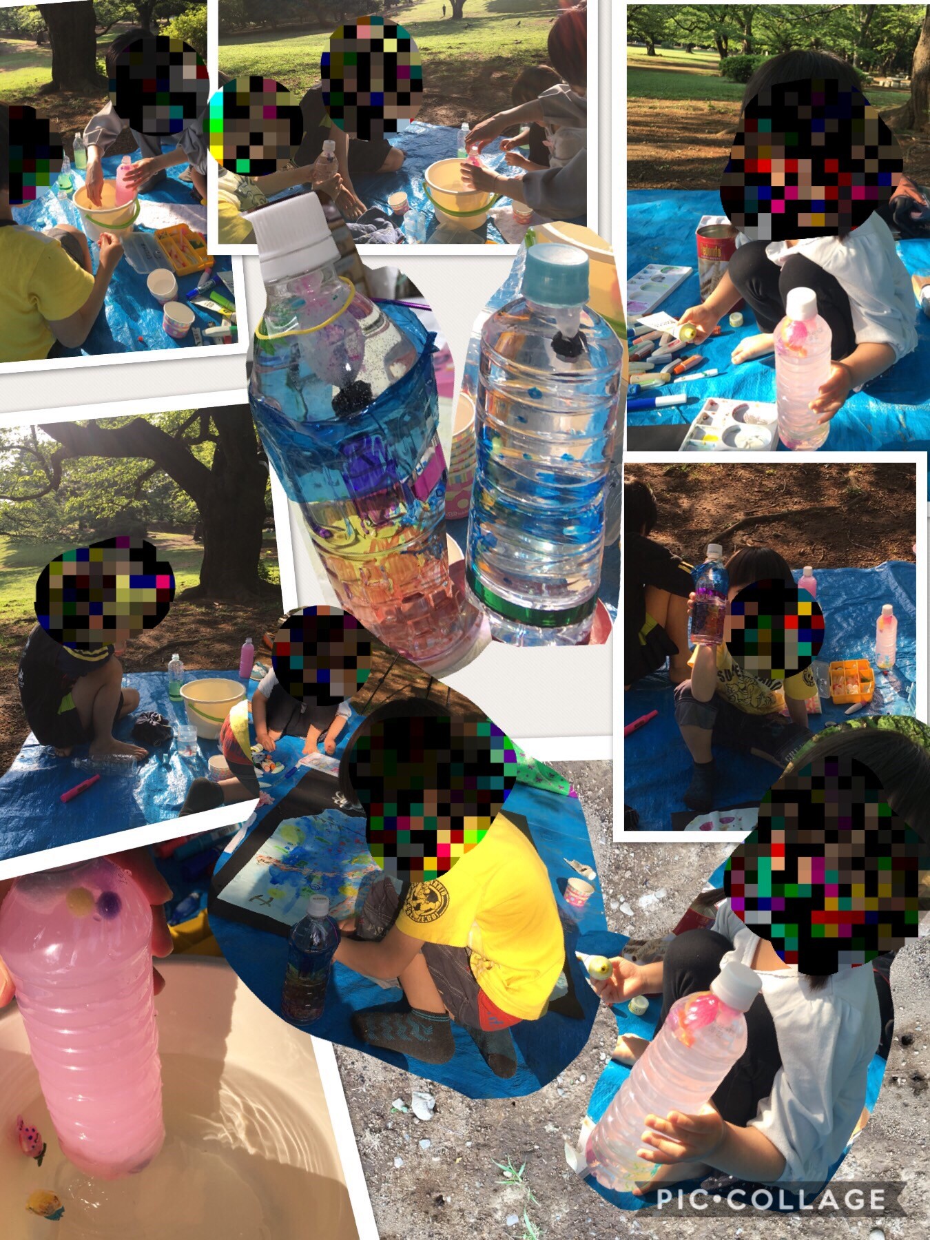 晴れの日は 野外の青空の下でお絵描きや工作をします。