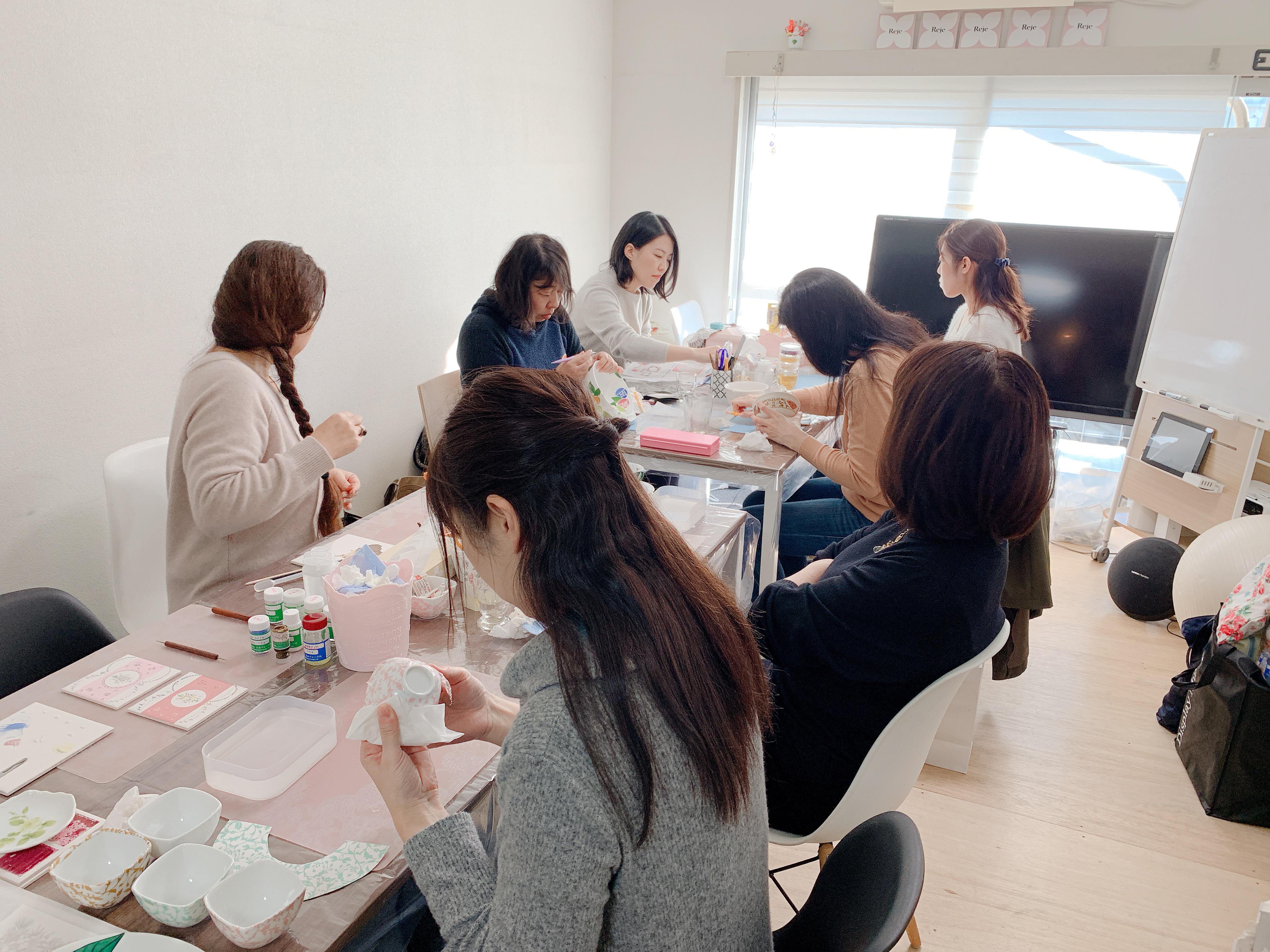 ポーセラーツ:白磁に転写紙というシートを貼ったり、絵の具でペイントしたりしてオリジナルのデザインを作っていただくことができます。800度になる電気炉で焼き付けることで市販されている商品と同じクォリティーの作品を作っていただくことができるクラフトです。趣味の講座から資格取得講座までご用意。