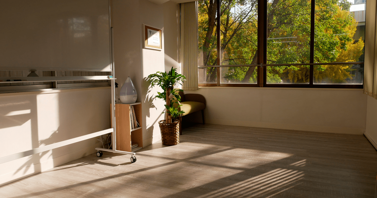 地下鉄矢場町駅から徒歩2分の便利な立地です。都心にありながら窓からは一面の緑が見える雰囲気の良い教室。