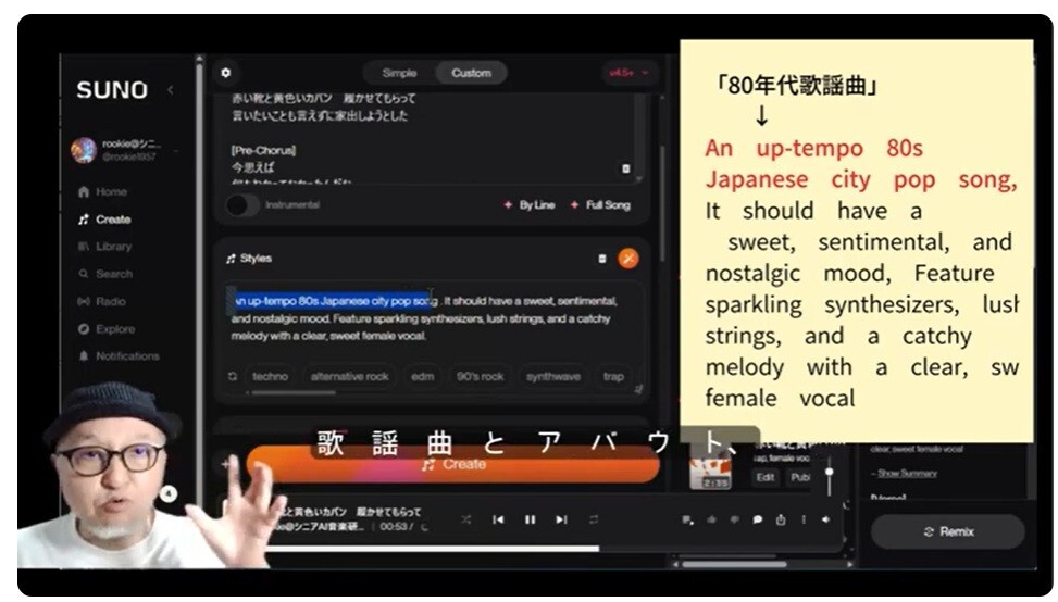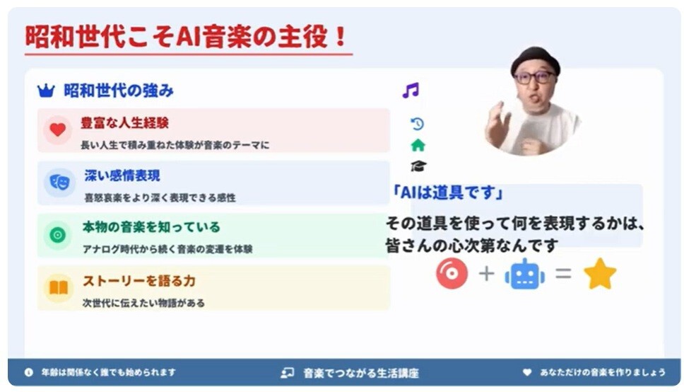 この講座では、「AIで人生を豊かにクリエイトする」をテーマに、特に人生経験豊かな昭和世代の皆様に向けて、音楽AIを使った新しい自己表現の可能性をお伝えします。