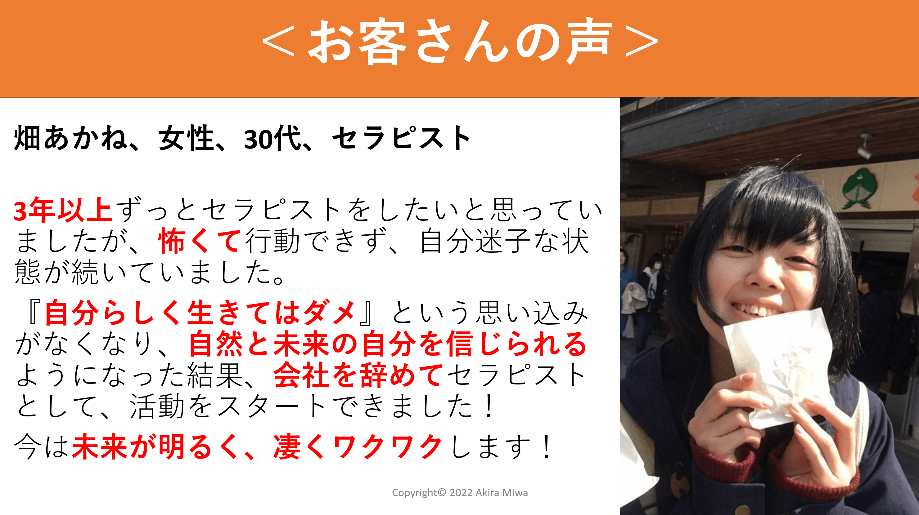 (畑あかね、女性、30代、セラピスト)