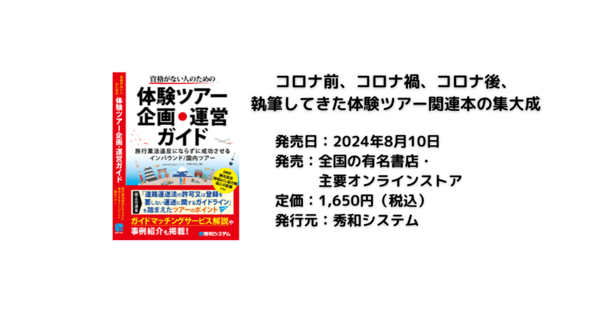 コロナ前、コロナ禍、コロナ後、執筆してきた体験ツアー関連本の集大成が2024年8月10日販売の『資格がない人のための体験ツアー企画・運営ガイド: 旅行業法違反にならずに成功させるインバウンド/国内ツアー』です。