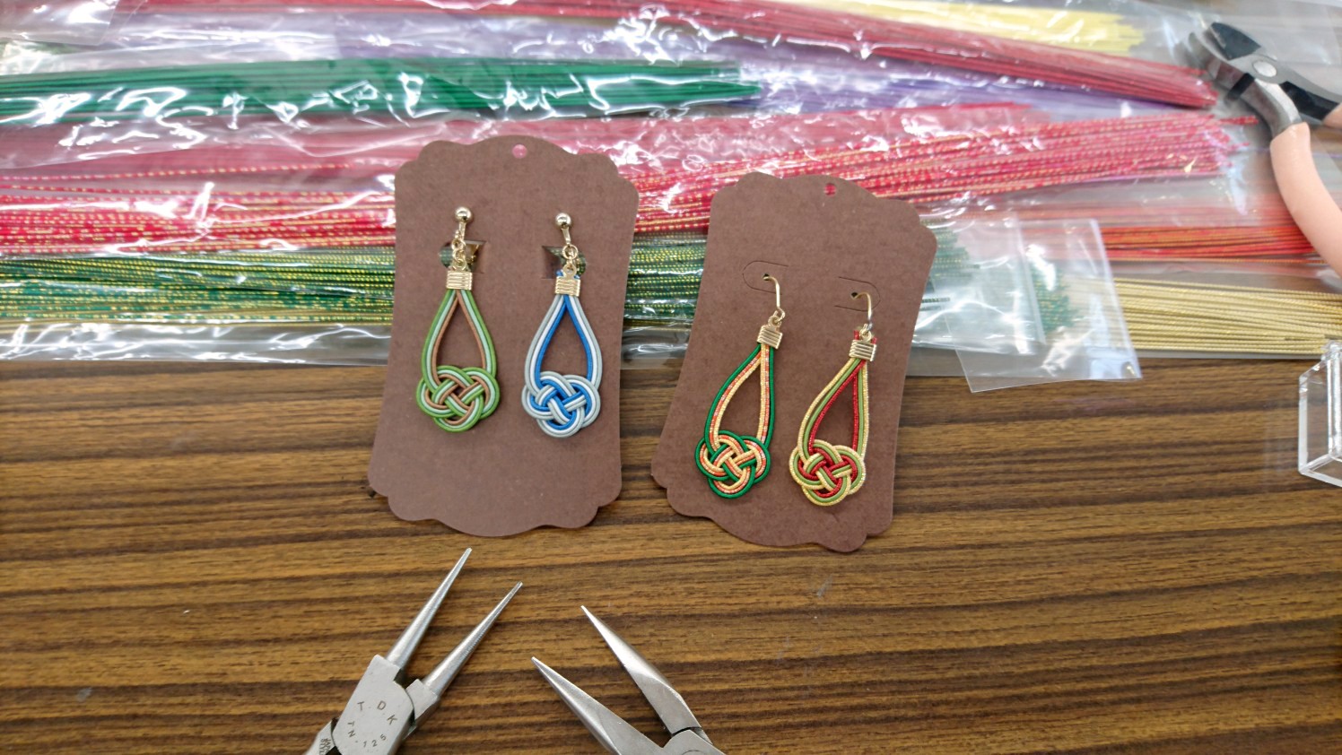 水引の基本の結び「あわじ結び」などをゆっくり練習しながらピアス・イヤリングに仕上げましょう。