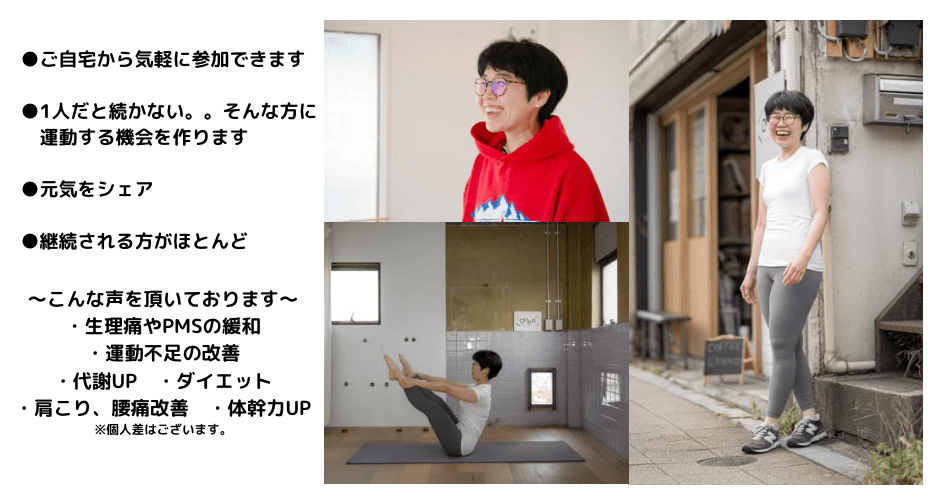 ピラティスは一人だと途中で挫けそうですが、先生も一緒に行ってくれるのでその姿に励まされながら最後までやれました。