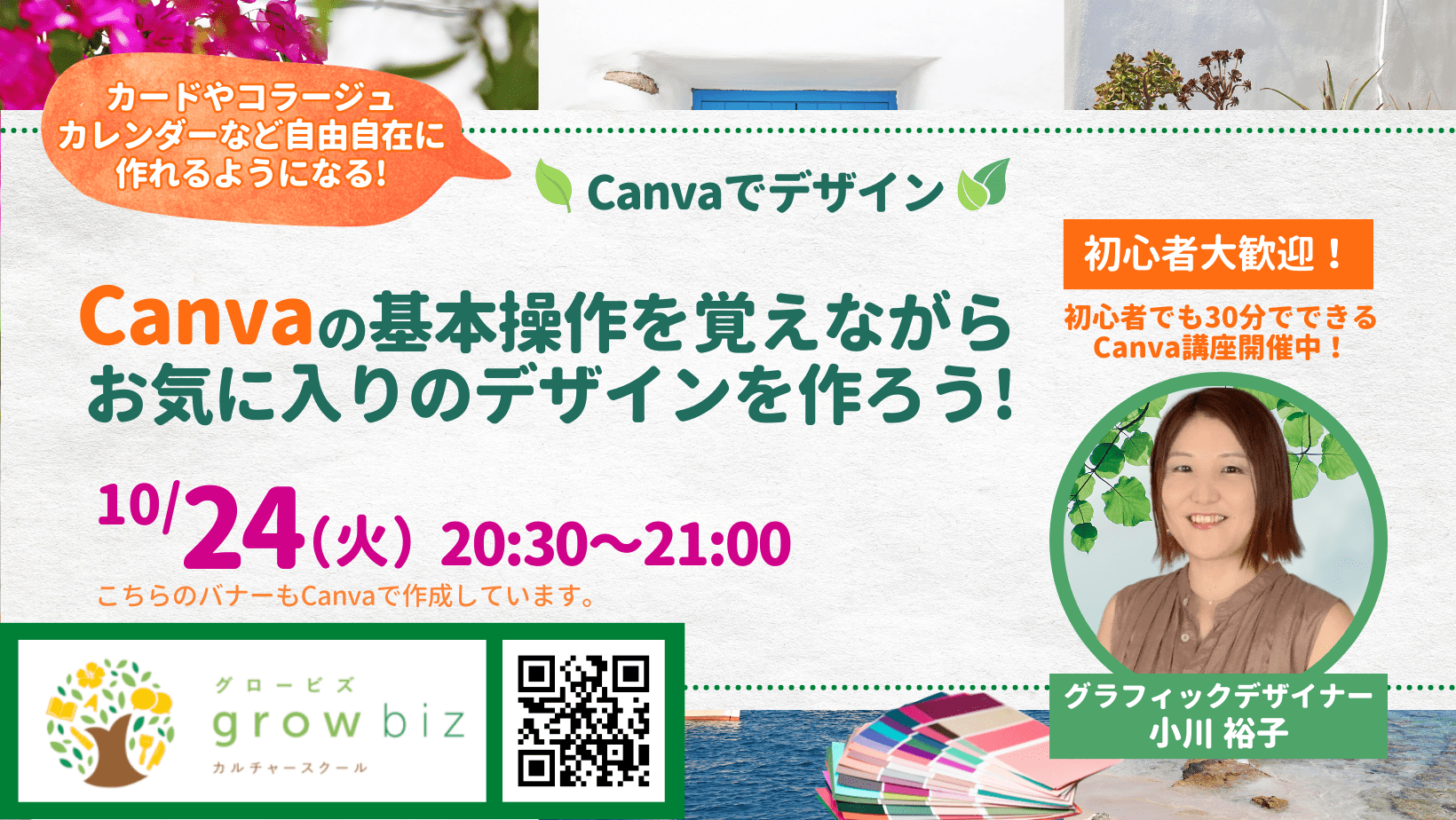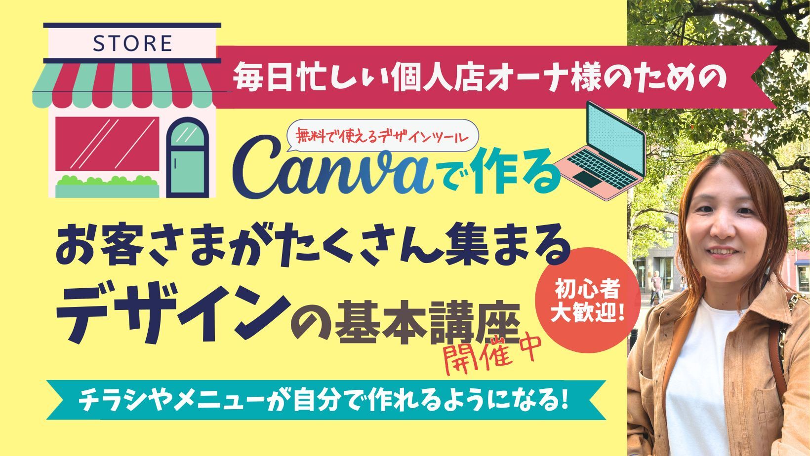 私自身はグラフィックデザイナー歴20年、お店のチラシを作成したり、バナーを制作してきましたので、その知識を生かして、手早く分かりやすいデザインするコツや押さえておいた方が良いポイントをお伝えします。