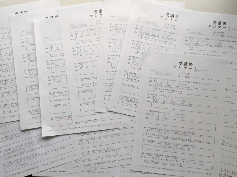 こちらの講座を受講したことで、時間に追われている時の私は特にネガティブな言い回しになっていたこと、先生が的確に質問してくださったことで自分の思考の癖が分かりました。そのネガティブな言い回しを子どもの耳に入りやすいようにどうポジティブに変換していくのか。とても勉強になりました。学んだことを定着させるため、機会を見つけてまた受講できたらと思いました。