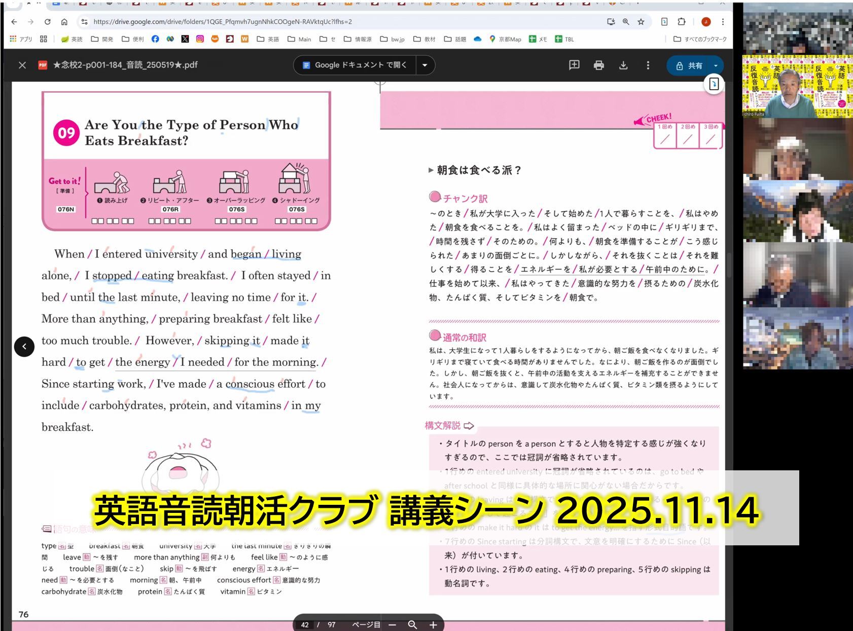 ① みんなで声出し。(音読はミュートでやっているので、他の人に自分の声が聞こえるという事はありません)