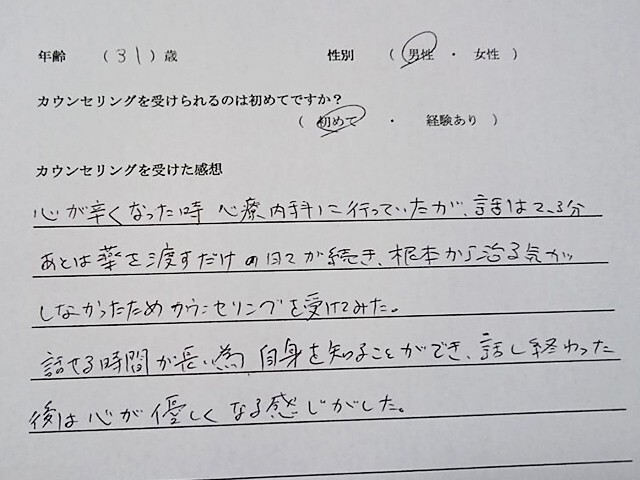 いつも親身に話しを聞いていただき、場合によってはアドバイスもいただけるので、大変有り難いです。
