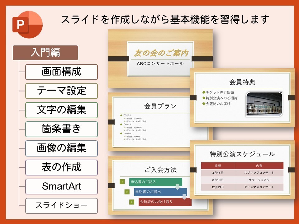 講座は、実際に文書やデータ、スライドを作成しながら基本操作を学習します。