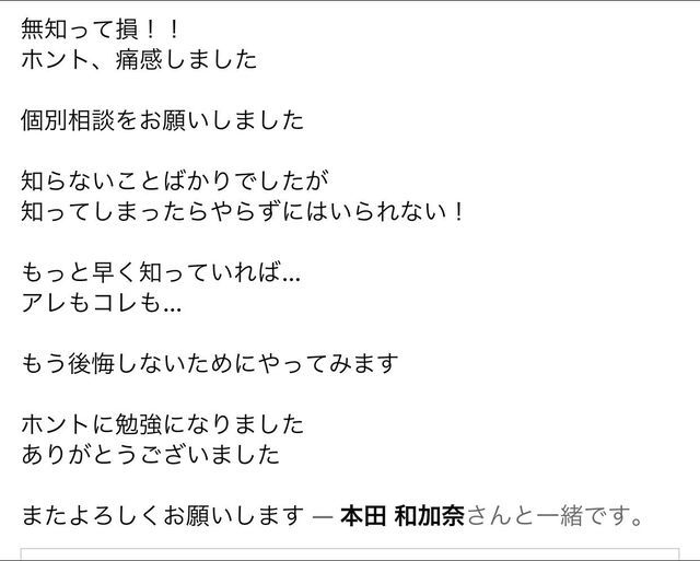 こちらの意見や行動、好きな食べ物、食事も丁寧に聞いてもらえ私に合った方法、無理のない取り組み方を教えて貰えた講座です。