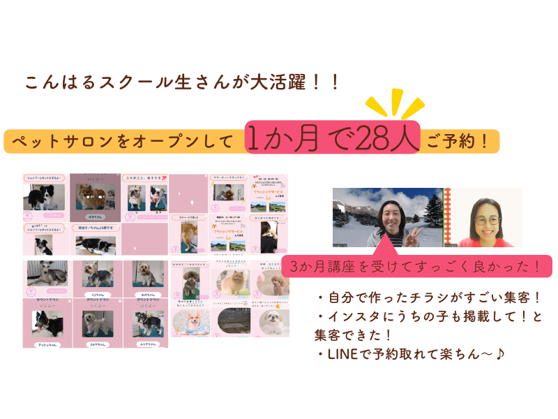 こんはる先生のサポートのおかげで、ペットサロンを無事にオープンすることができ、チラシやインスタの投稿、HP、公式LINEと集客に必要なアイテムを自分で作れるようになりました。