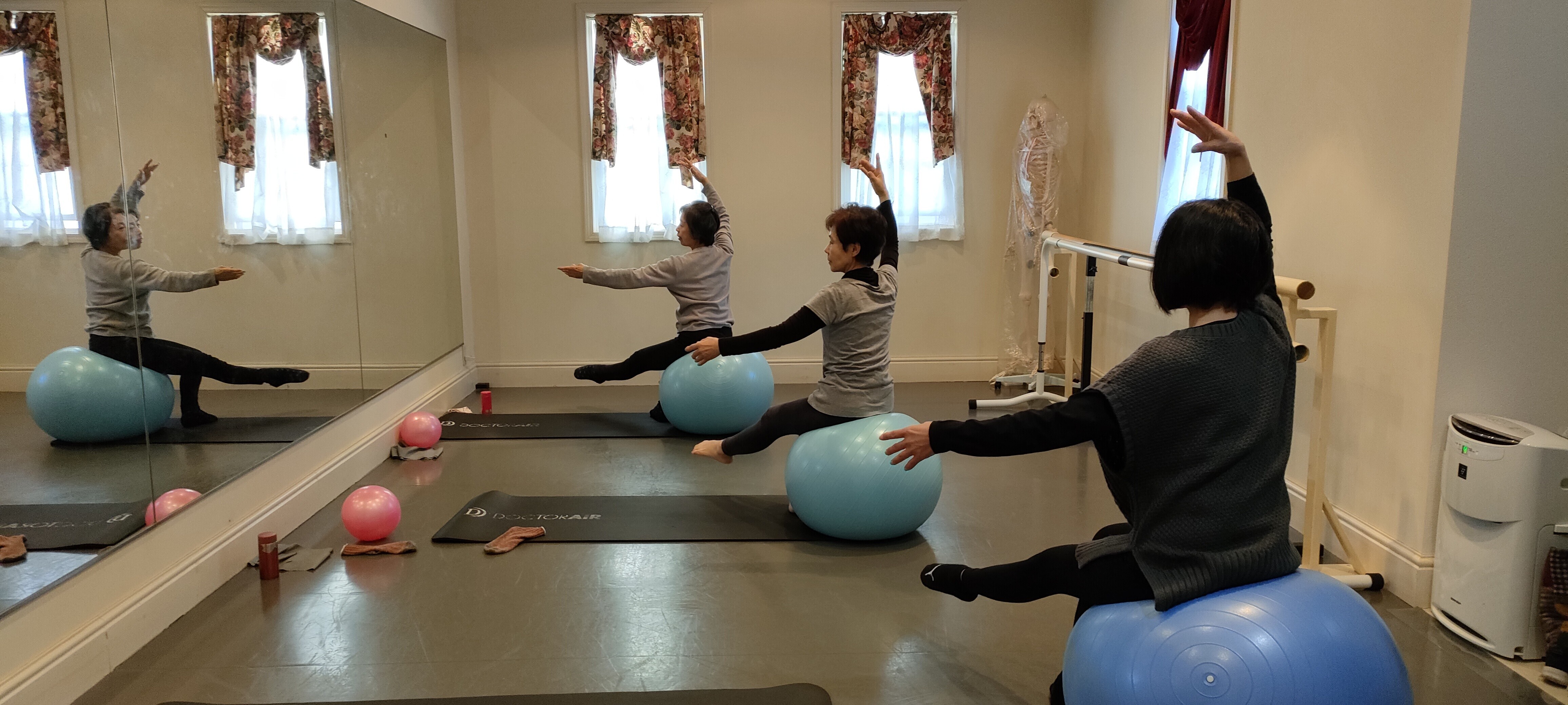 ボールやゴムバンドを使って正しいバレエの身体の使い方を習得しつつ、まずは一通りのバーレッスンをできるようにします。