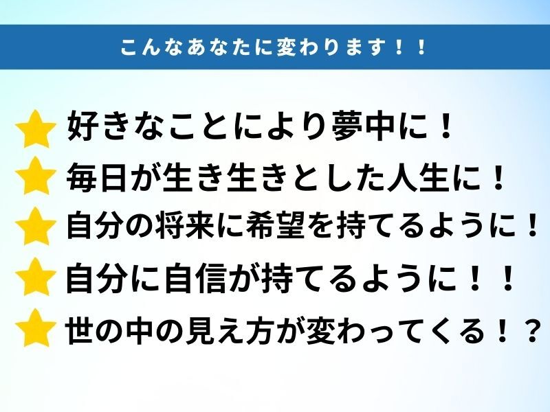 「未来に希望が持てる!」「仕事の辛さから抜け出せる!」と、受講後に実感していただける講座内容を、あなたに合わせた形でお届けします!