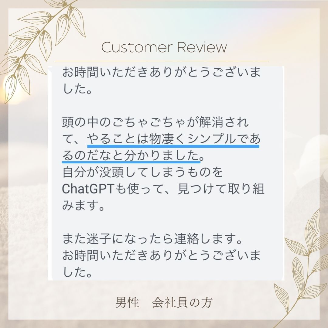 自分が言語化したいことを、chatGPTの助けをかりながら、形にしていけるようになりました。分からないことも、私のペースにあわせてくださり、優しく教えていただけて、楽しい時間でした。活用していきます。ありがとうございました😊