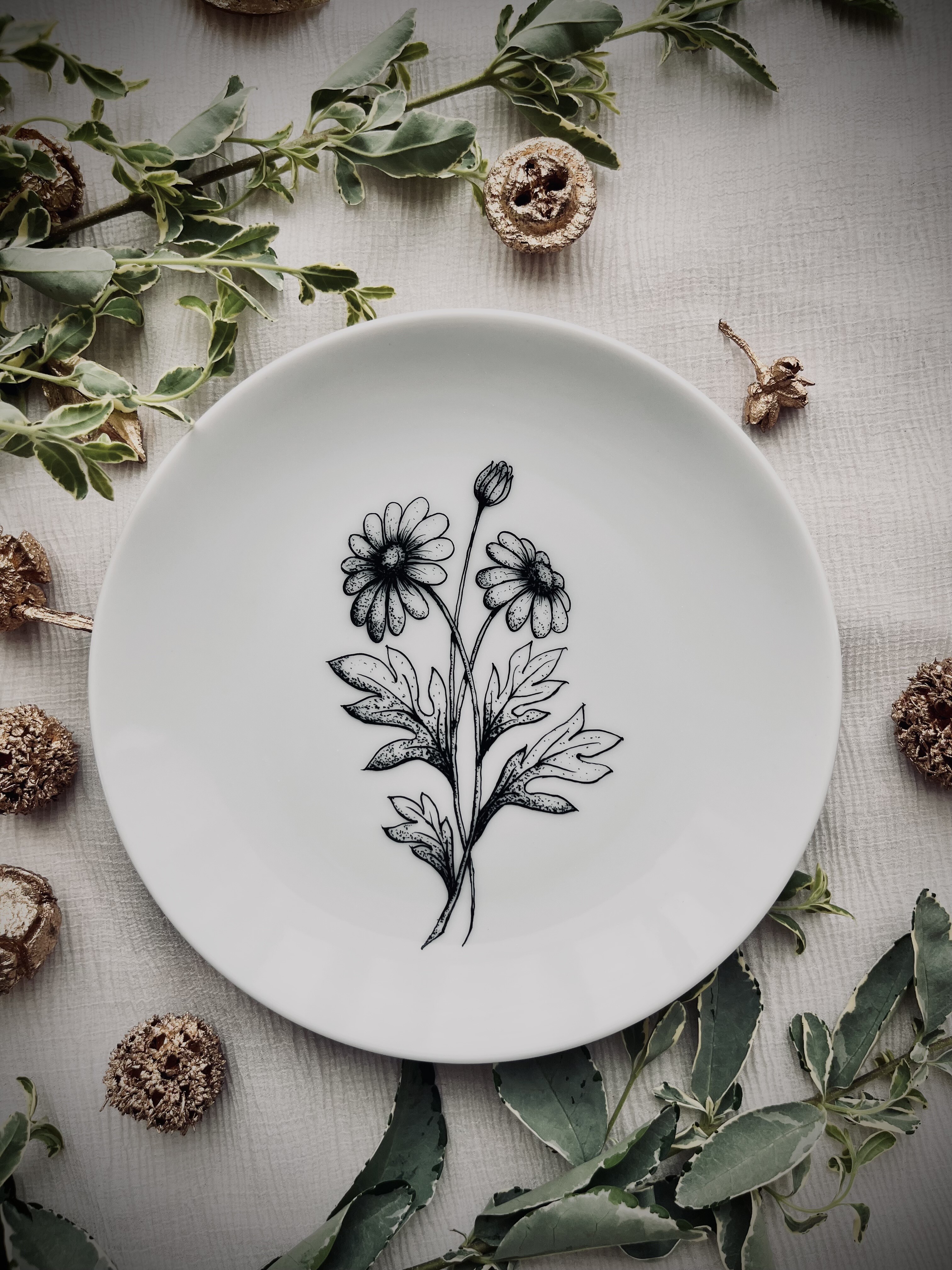 白い食器につけペン(ディップペン)を使って手描きするアート体験をお届けしています。