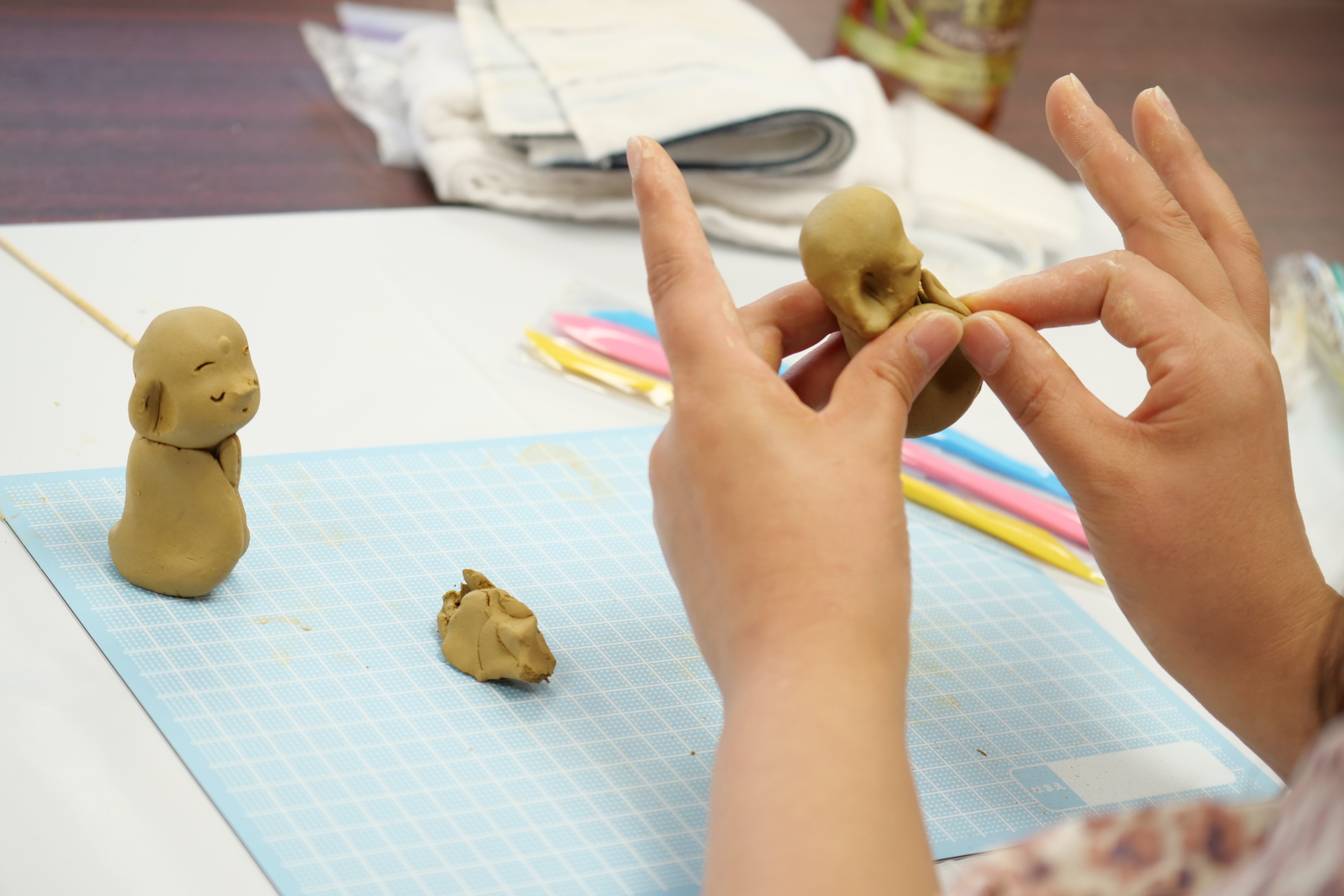 オーブン陶土を使った人形作りを基礎から学びたい人のための教室です。参加者の皆さんと対話する形式で進めますので、自由に楽しく学んでいただけます。月謝制ではなく単発でも開催していますが、連続で学ぶことで技術がしっかりと身につきます。そしてお得です。
