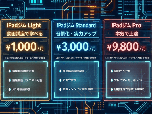 ・その他iPadの付属品(Apple Pencil/Smart Keyboard など)は、あるに越したことはないですが、必需品ではありませんので、問題なくカリキュラムを受けて頂けます。