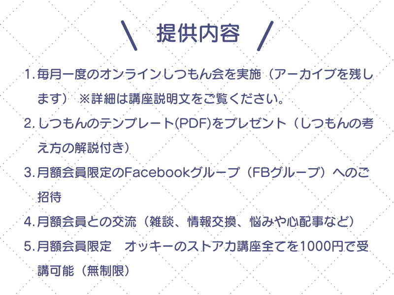 4)月額会員は、何度でもオッキーの講座を50%OFFで受講可能