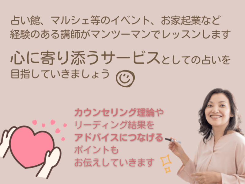 占いのプロになりたい、ライフワークとして占いで誰かの役にたっていきたいという方が自信をもって占いが出来るようになるまでサポートします。半年程度で卒業出来るレベルを目指します。