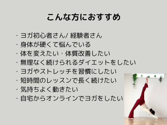 その後、ヨガスタジオや自宅レッスンなどで週5本のレッスンを開催。