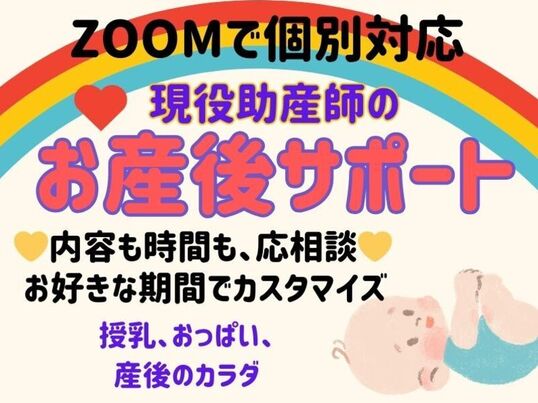 ZOOMにて授乳、おっぱい、ママとベビーのケアなどご相談内容は自由。1回30~40分、月3~4回程度の継続で最長2カ月で一区切りします。