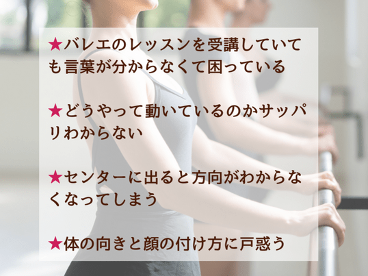 姿勢や立ち方から始まり、バットマンタンジュなどの動かし方やジャンプの種類、舞台の方向、顔の付け方、ポールドブラについて、学べます。