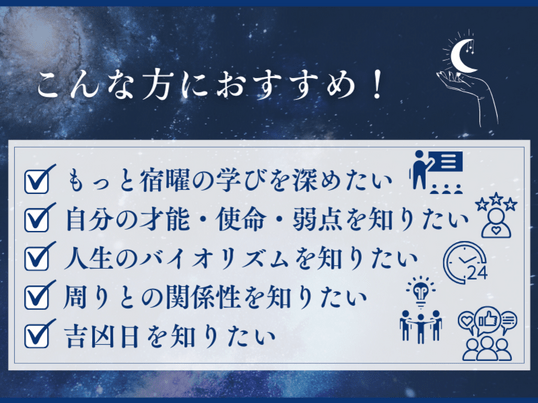 ※こちらは「初めてでも簡単!宿曜占星術の基本〜入門編〜」を学ばれた方に限ります。