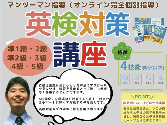 英検・受験では「余力を持って合格」、定期テストでは「大幅な得点アップ」を実現させます!月額料金で授業時間外にも様々なサポートが受けられます!