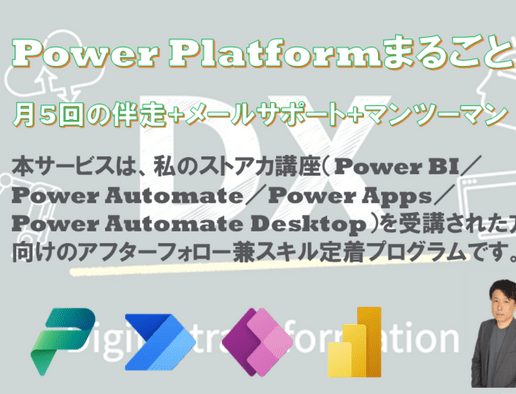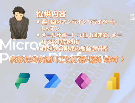 ・本サービスは、私のストアカ講座(Power BI/Power Automate/Power Apps/Power Automate Desktop)を受講された方を対象としています。それ以外の方は、事前にご相談ください。