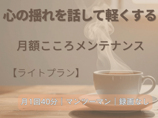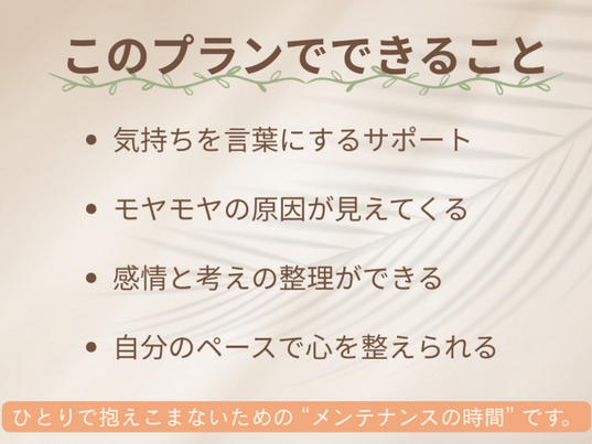 心の揺れをひとりで抱えず、月1回安心して話しながら気持ちを整理するシンプルなこころメンテナンスです。